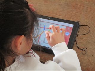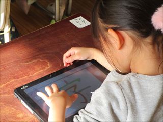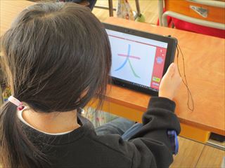 1年1組では、タブレットで「漢字の書き方レッスン」に取り組んでいました。