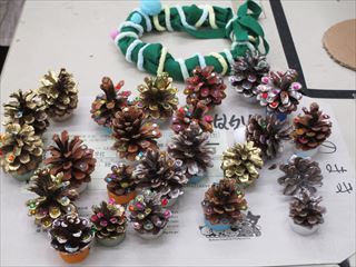 松ぼっくりに色を塗ったり、ビーズをつけたりして、きれいな飾りができていました。
