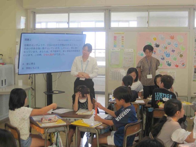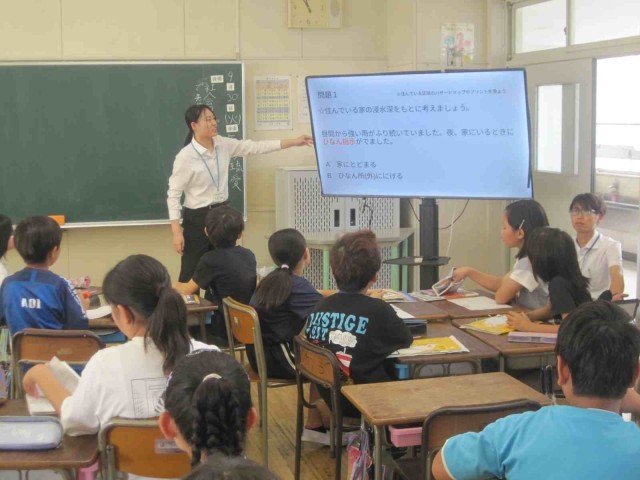 4年生社会科の研究授業です。本時のねらいは、「クロスロードのゲーム活動を通して、風水害から身を守るために災害前の備えの大切さに気付くことができる。」です。