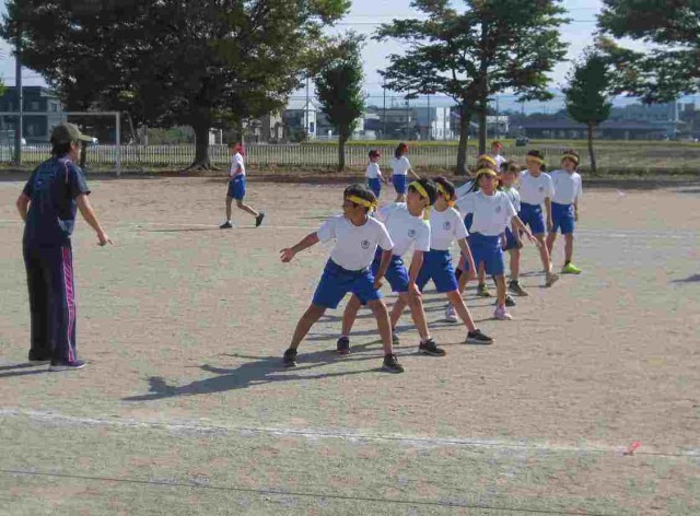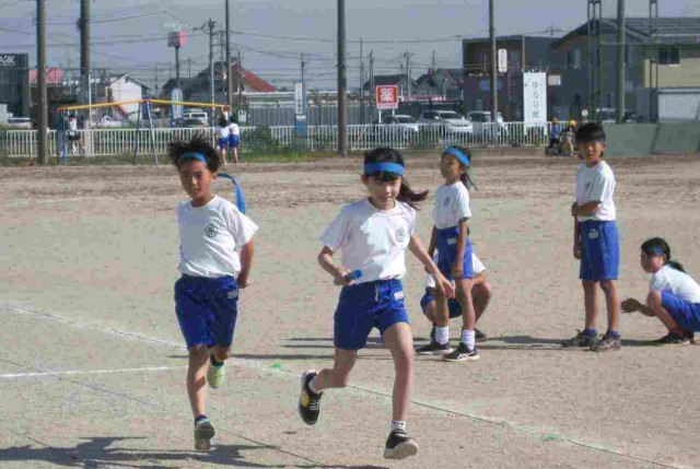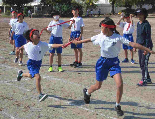 中学年のリレー練習です。上手にバトンをつなげるといいですね。バトンの受け渡しが勝利の鍵を握っています。