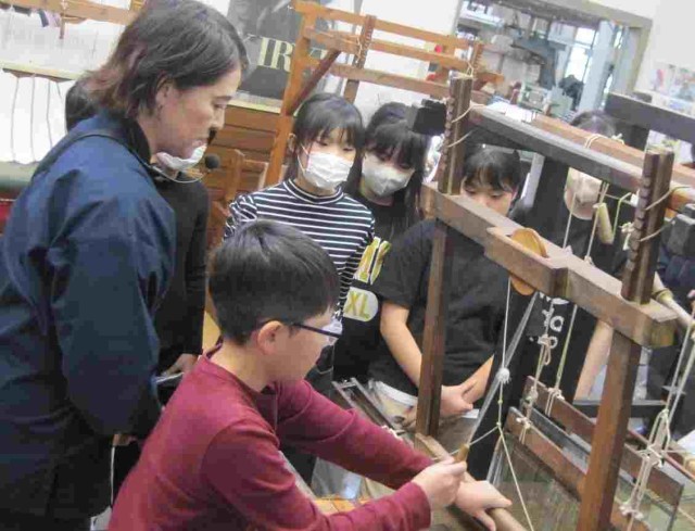 織物の歴史について、話を聞くとともに体験することで、機械等の進化を感じられたようです。最後は、のこぎり屋根をバックに写真撮影をしました。
