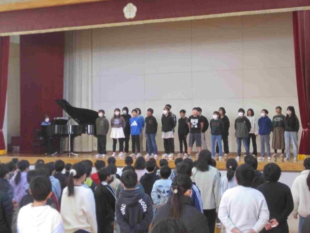 インフルエンザ流行で延期となっていた音楽集会を開催することができました。第2回 音楽集会のテーマは「みんなで一緒に夢に向かおう!」でした。「チャレンジ」と「友だちはいいもんだ」を歌いました。しっかり歌が歌える南小の子供たちです。音楽に合わせて身体が横にゆっくり揺れて楽しそうな児童がたくさんいました。