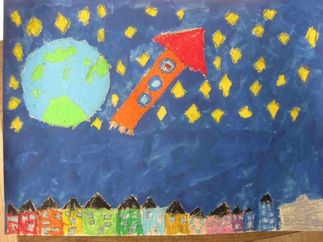 1年生が描いた作品です。単元「おはなしだいすき」で、「モリスくんとオレンジいろのドレス」という本を読んで、自分の思いを表現しました。すてきな作品ですね。