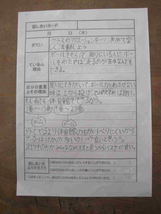 4年生の学級活動を参観しました。今日のテーマは、学級レクを考えることでした。話し合いカードのワークシートをよりどころにして、意見を交換しました。先生がサポートする場面もありましたが、自分事として考えることが大切ですね。サポートされることで、今後の話し合い活動の参考にしてほしいと思います。