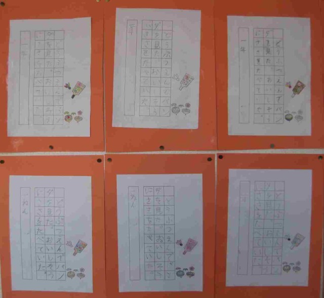 1年生の廊下に掲示されている硬筆の作品です。丁寧な字を書こうという思いが伝わってきますね。