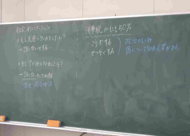 6年生の社会の授業開きです。「もしも、○○だったら」というお題をもとに、グループで話し合っていました。子供たちの目が輝いています。