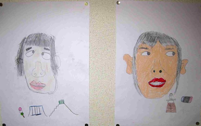2年生の廊下に飾られている図工作品です。自己紹介を兼ねているので、自分の好きなことが絵で表現されています。
