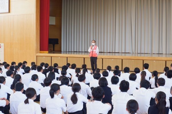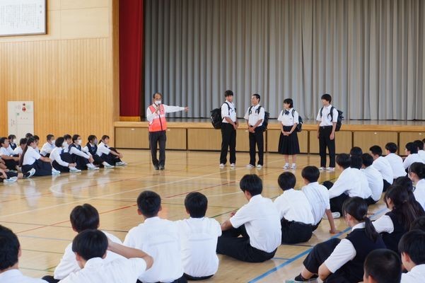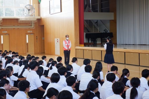 1年生の教室に不審者が侵入したという想定で、伊勢崎警察署の方に指導を受けながら避難訓練を行いました。今回の避難訓練は、不審者を刺激しないように落ち着いて避難すること、不審者を生徒から遠ざけることが大事です。生徒の避難や先生の対応もよくできていました。最後に警察署の方にアドバイスをいただき、校外で不審者にあったらどうしたらよいかも具体的に話してくれました。これから日が暮れるのが早くなるので、不審者に気をつけるようにしていきましょう。