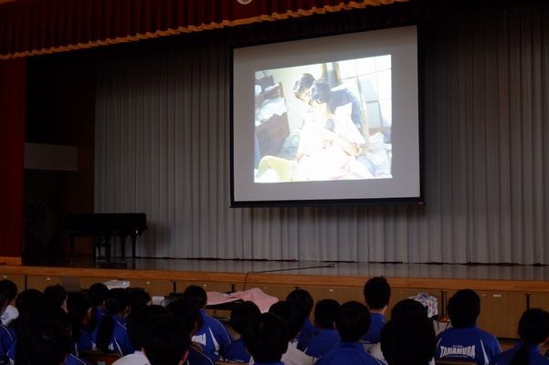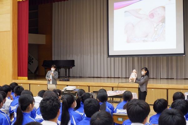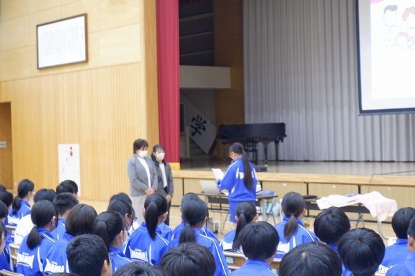 2年生で助産師さんを招いて命を育む授業を行いました。玉村町では小学校5年生と中学校2年生で行っています。しかし、内容は少し違います。命の生まれる奇跡、みんな望まれて生まれてきたこと、一人一人が生きる力をもっているという内容に加え、何よりも二人の同意が大切だという男女の関わり方、命に責任をもつことなど、自らの性に関する内容も話してくれました。出産の映像を見たり、実際に心音を聞いたりして分かりやすく具体的な話だったので、みんな真剣に聞いていました。まずは、自分を大切にすること、そしてまわりの人も大切にできるようになってほしいと思います。