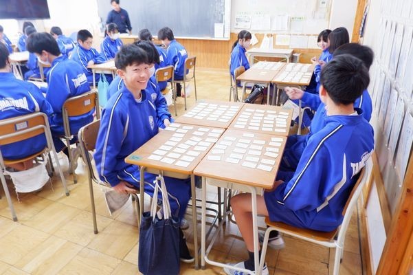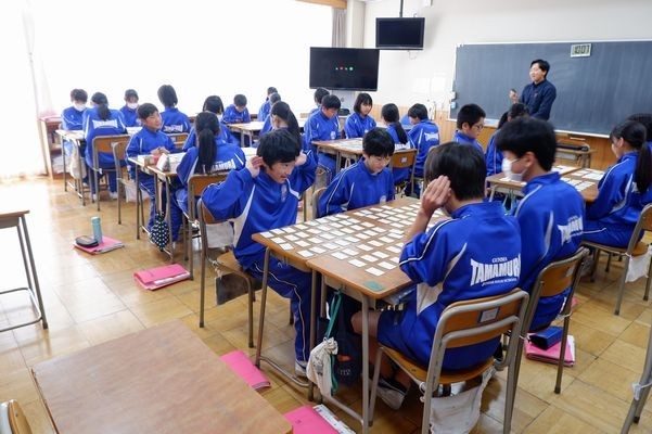 1年生の教室から、百人一首の句を読み上げる声が聞こえてきました。これまで親しんできたカルタと違って、下の句が書かれた文字の札をとりので、苦戦しています。お気に入りの句を覚えていると、早く取れますよ。5・7・5・7・7のリズムを感じ、お気に入りの句を増やしましょう。ちはやふるです。