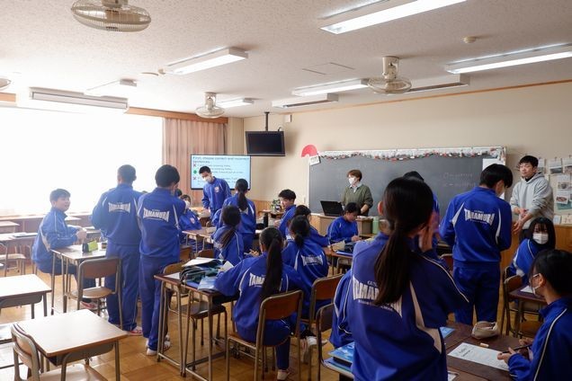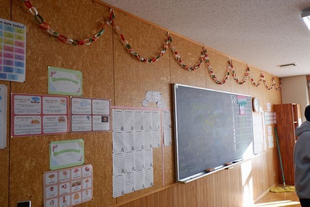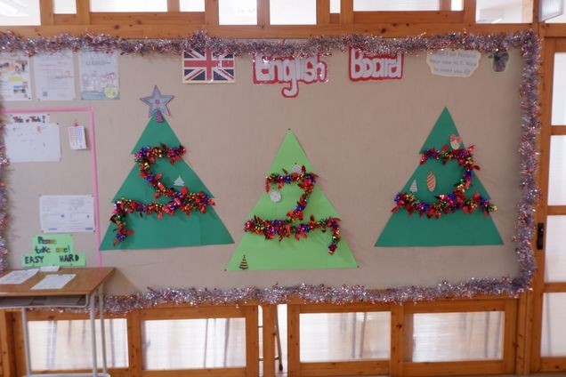 ALTの先生と授業をする時は、英語ルームで行います。英語ルームの廊下にあるイングリッシュボードは、クリスマスの飾り付けになっています。教室の前後の黒板にも飾り付けがされています。声が聞こえるので見てみると、3年生が楽しそうに