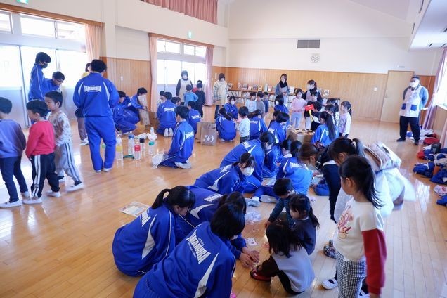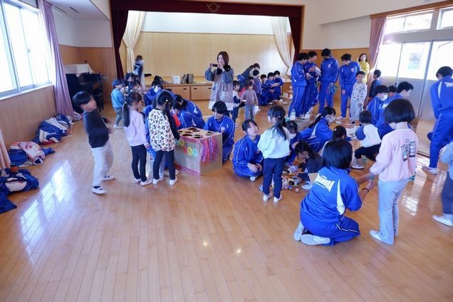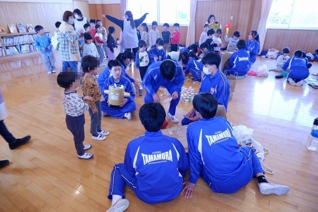先週に続いて今週も3年生の家庭科でクラス毎に保育実習をしています。先週とは違う保育所にお世話になっています。幼児と一緒にゲームをしてから、自分たちで作ったおもちゃで幼児に遊んでもらっています。みんな笑顔で活動しています。