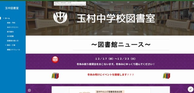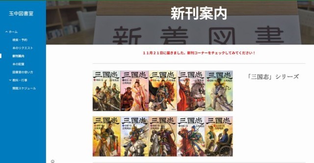 玉村中図書室のHPが開設しました。玉中生限定です。図書室にある本の検索、予約、新刊案内、図書室イベントのお知らせなどが見られます。早速予約も入ったようです。今日は図書委員長がお昼の放送で、HPの紹介や今後の図書室イベントを告知しました。面白い本もたくさんあります。ぜひ、本を読んでみましょう。