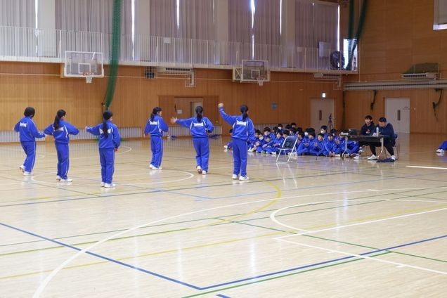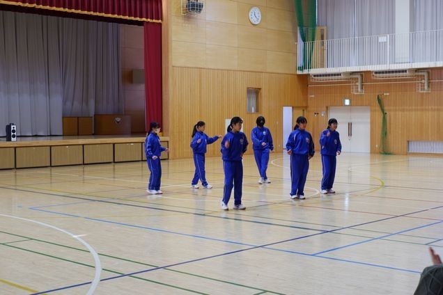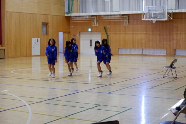 1年生の体育の授業でダンス発表会をしていました。男女で柔道とダンスに分かれて体育の授業をしていましたが、今日は区切りで女子がダンスの発表会をしました。3学期は男子がダンスの学習になるので、男子も見学をしていました。音楽にのって楽しそうに踊っていました。女子は3学期から柔道をします。
