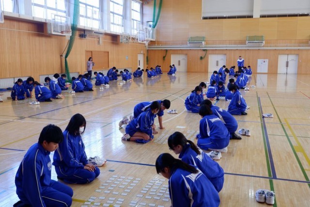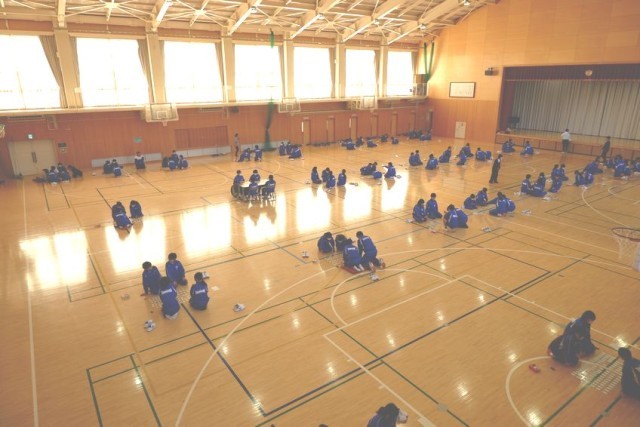 1年生が体育館で百人一首をしていました。楽しみながら、古文に親しむことができるので国語としてもよい取り組みです。百人一首は覚えている方が断然有利です。和歌をいくつ覚えるかが勝負です。この後、学年百人一首大会を開催するそうです。