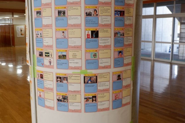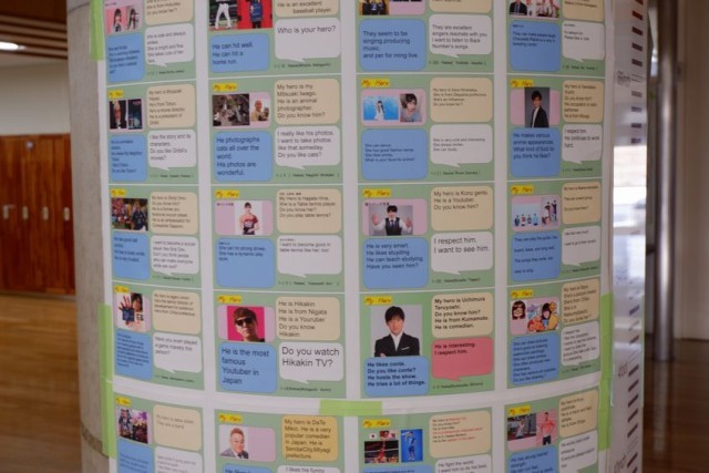 1年生のホールに英語の授業で作成した「My Hero」が掲示してあります。自分のヒーローを写真を貼って英語で紹介しています。スポーツ選手やタレント、お笑い芸人、ユーチューバーなど、バラエティに富んでいます。眺めているとなかなかおもしろいです。