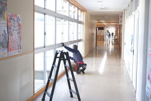 今日は朝からたくさんの業者の方が来て、ガラスの清掃をしてくれています。生徒では手の届かない上の方のガラスや外側をきれいにしてくれています。光もよく通って、廊下も明るく感じます。
