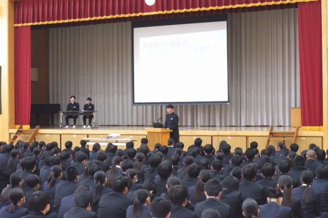 6校時に生徒総会が開かれました。各専門委員長からの活動報告、生徒会行事の報告、生徒会費の決算報告などが行われ、承認されました。生徒会は生徒全員で組織され、その代表である生徒会長などの本部役員は選挙で選ばれます。また、全員が所属する専門委員会も生徒会の活動です。生徒会活動は民主主義そのものです。生徒会で作ったパンフレットには生徒総会の意義やしくみも解説されていました。
