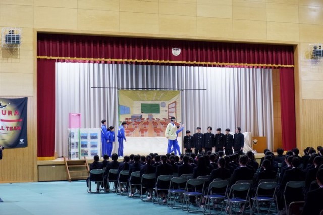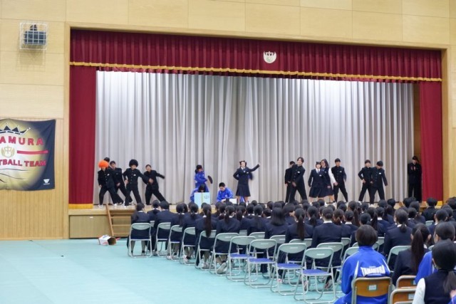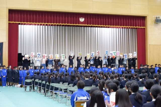 3年生を送る会が開かれました。1、2年生の出し物は脚本から衣装、小道具、大道具まで自分達ですべて考え創り上げました。劇やダンス、歌やメッセージなどに3年生への感謝の気持ちが表れていました。見ている生徒も、笑ったり歓声をあげたり手拍子をしたりして、盛り上げていました。