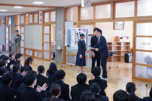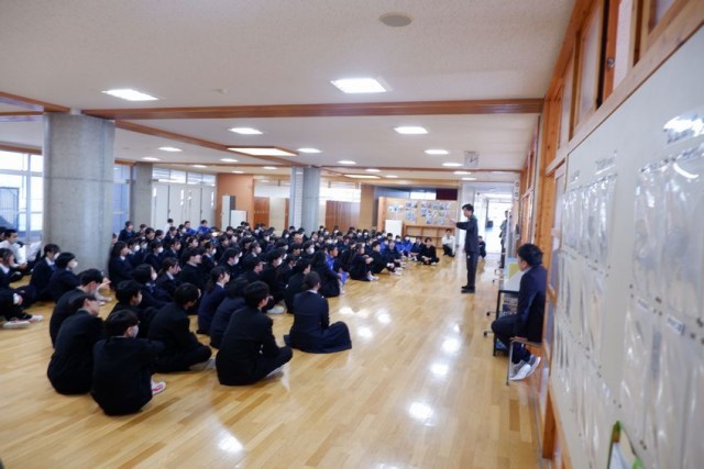 3年生は最後の学年集会を開いていました。学年の先生が最後のメッセージを伝えています。時折笑い声や拍手もおこり、和やかな雰囲気の集会でした。3年生はみんな先生の方を向いてしっかり聞いていました。先生と生徒の思いが一つになっているようでした。最後、生徒からのサプライズもありました。