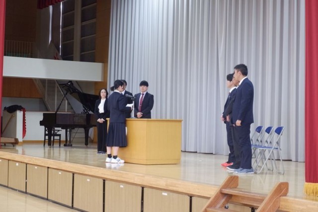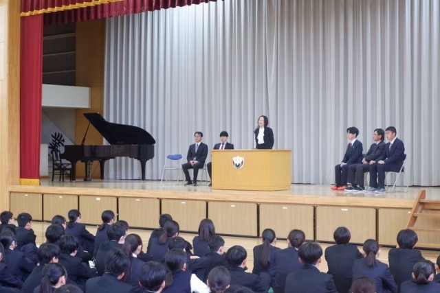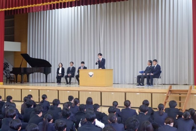 令和8年度最初の行事は新任式です。今年度は新たに6名の先生を迎えました。玉村中で初めて先生になった人のいれば、経験のあるベテランの先生もいます。それぞれの先生の持ち味を生かし玉村中学校を盛り上げていってほしいと思います。最後には、生徒会長から歓迎の言葉がありました。