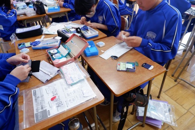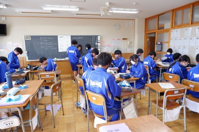 先週から時間表により授業が始まっています。2年生の教室では、家庭科の授業で裁縫をしていました。昔は技術科は男子、家庭科は女子という時代もありましたが、今は男女関係なく技術科も家庭科も学習します。生活をよりよくしていくためには、基本的な裁縫の技術も必要です。