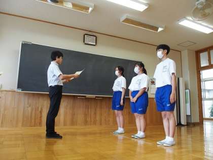 7/13「栄光をたたえる」リモート表彰 公開日 2023/07/13 更新日 2023/07/13 学校・学年行事 朝の時間にリモートで表彰をしました。主に6〜7月の活躍が対象です。 今回は、伊勢崎佐波歯科保健図画・ポスター・標語コンクール、少年の主張、剣道、体操、水泳、卓球でした。 学友の活躍をみんなで喜びました。 1年 2年 3年 PTA