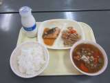 今日の給食は、ピリ辛豚きんぴら、さばの梅ソースかけ、けんちん汁、ごはん、牛乳でし...