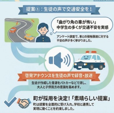 12月に行われた子ども議会において、『生徒の声で交通安全を呼びかけたい』という提案を行ったところ、南中の生徒による交通安全啓発アナウンスを作成する機会をいただきました。