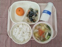 群馬県のソウルフードであるみそパンです。みそパンのみそだれは味噌、砂糖、みりん、黒糖をまぜて作っています。これを食パンにつけてオーブンで焼いています。甘じょっぱい味がおいしいみそパンです。今日で1学期最後の給食だったので、明日からはしばらく給食作りはお休みです。食器をきれいにみがいたり、普段なかなかできないようなお掃除をしたり、試作をしたりします。また2学期からおいしい給食を提供できるよう頑張ります。