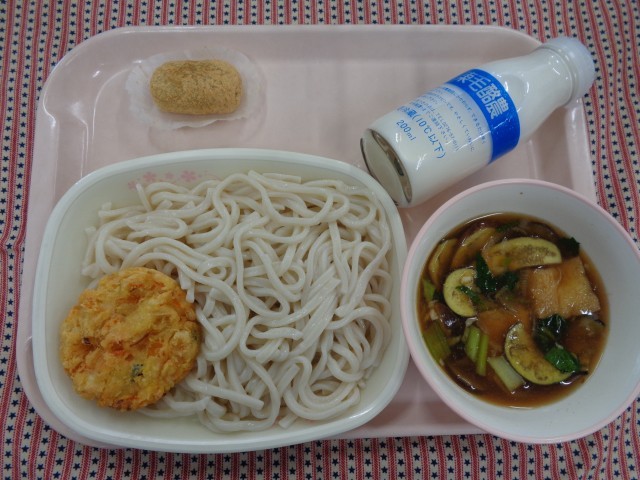 うどん 牛乳 かぼちゃと大豆のかき揚げ なすと豚肉のうどん汁 おはぎ