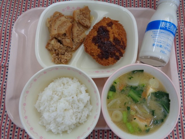 ごはん 牛乳 ホキフライ 車麩のそぼろ煮 田舎汁