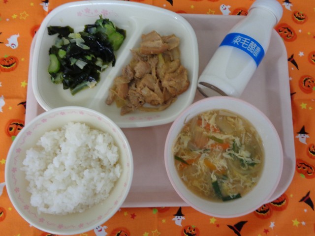 ごはん 牛乳 味噌だれ焼肉 わかめのさっぱりあえ 中華卵スープ