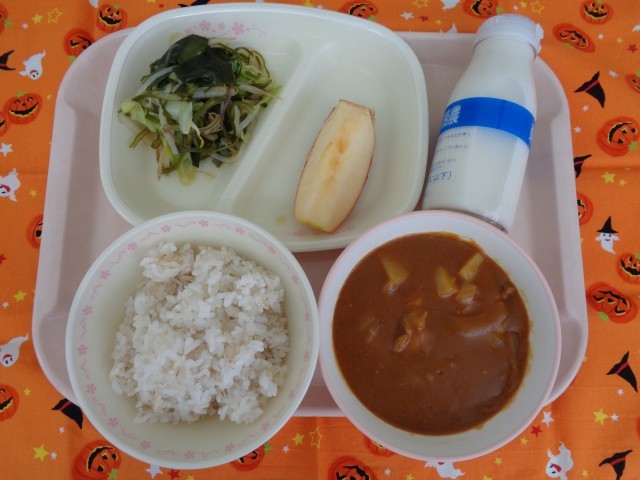 麦ごはん 牛乳 海藻サラダ ポークカレー りんご