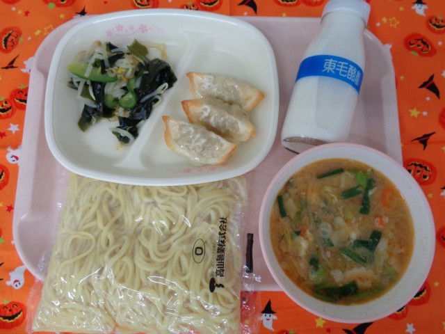 ラーメン 牛乳 焼きぎょうざ もやしとわかめのサラダ 味噌ラーメンスープ