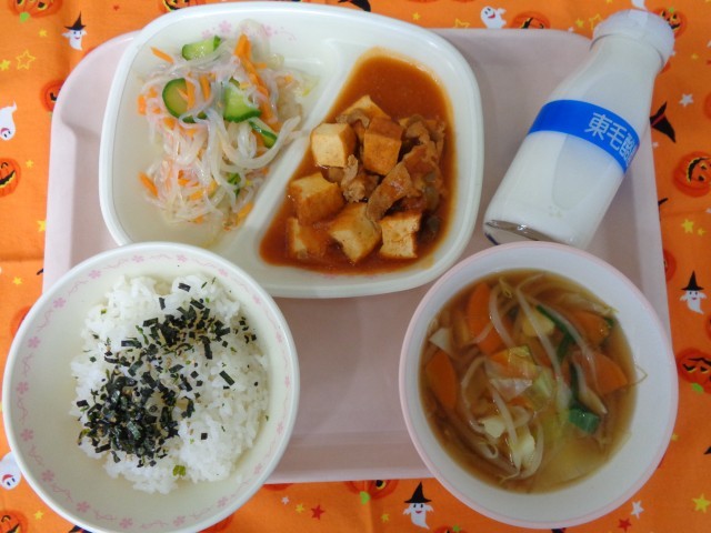 ごはん  ふりかけ  牛乳  厚揚げのチリソース炒め  しらたき中華サラダ  ワンタンスープ