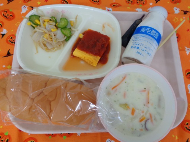手作りオムレツトマトソース こんにゃくサラダ さつまいものクリームスープ