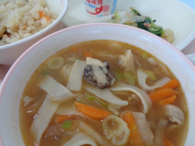 今日10月24日は「学校給食ぐんまの日」です。給食に群馬県の農作物をたくさん使うことで、ふるさと群馬の豊かな自然の恵みを再発見してもらえるよう、定められました。そこで、今日は群馬県の郷土料理「おっきりこみ」です。群馬の女性は「かかあ、天下」、と呼ばれ働き者の女性を意味しています。そんなかかあ天下が子育てしたり忙しく働きながら食事の支度をしていて忙しかったことから、麺を打ち直接鍋に入れていく「おっきりこみ」は働くお母さんたちに受け入れられたのです。鍋1つで赤・黄色・緑の食材がそろうので、健康のこともしっかり考えられています。