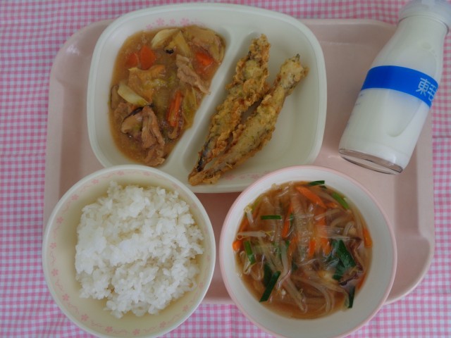 ごはん 牛乳 ししゃもの磯辺揚げ ジャージャン豆腐 春雨スープ