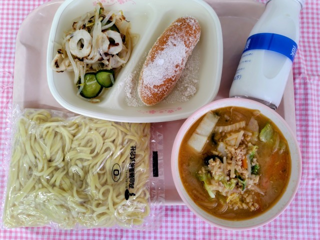 ラーメン 牛乳 キャラメル揚げパン ちくわサラダ みそラーメンスープ