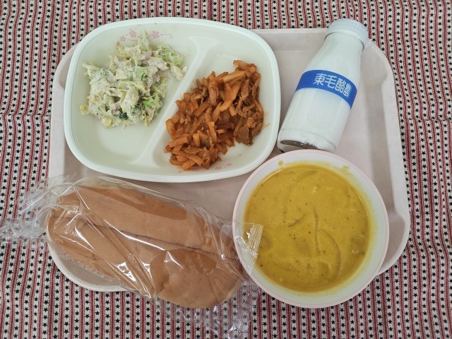 背割りコッペパン  牛乳  豚肉とじゃがいものカレー粉とケチャップ炒め