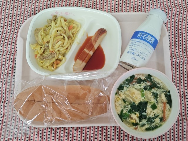 背割りコッペパン 牛乳 ウインナーケチャップソース 豚カレーまぜまぜうどん 卵野菜スープ