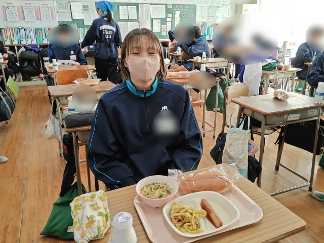 今日は夏休みに応募してもらった、元気いっぱい栄養満点レシピのレシピ賞を受賞した、南中の櫛渕さんのレシピで豚カレーまぜまぜうどんです。豚肉、玉ねぎ、にんじん、キャベツを炒め、カレー粉とマヨネーズ風の調味料で味付けし、うどんも一緒に炒めました。カレーの風味が食欲をそそる一品です。素敵なレシピをありがとうございました。