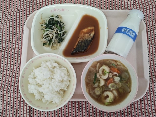 ごはん 牛乳 さばの味噌だれがけ ほうれん草のごまあえ きりたんぽ汁