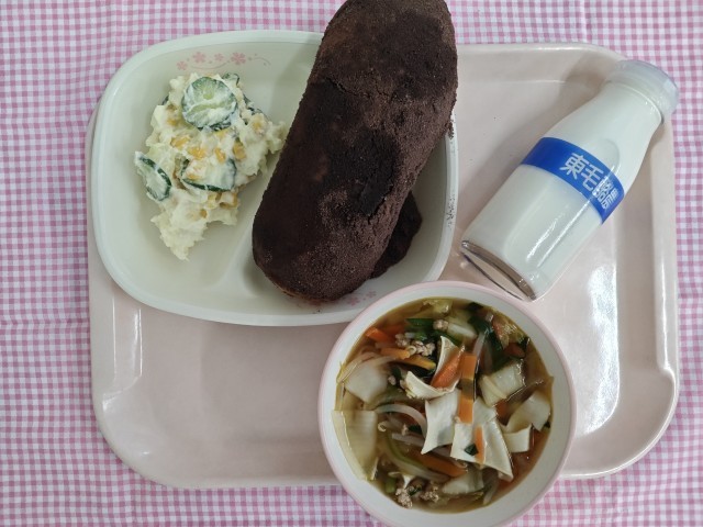 ココア揚げパン 牛乳 コーンポテトサラダ ワンタンスープ