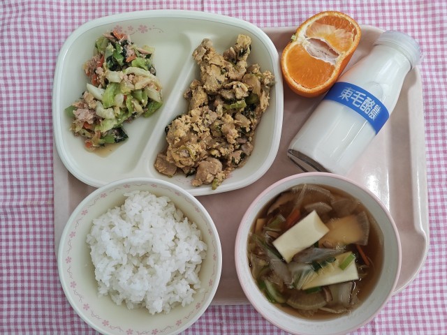 ごはん 牛乳 高野豆腐のたまごとじ 小松菜とツナの和え物 はっと汁 (中)みかん