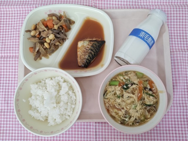 ごはん  牛乳  さばのみそだれかけ  五目豆  かきたま汁