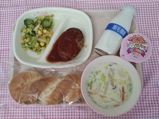 ツイストロールパン 牛乳 ハンバーグトマトソース コーンサラダ