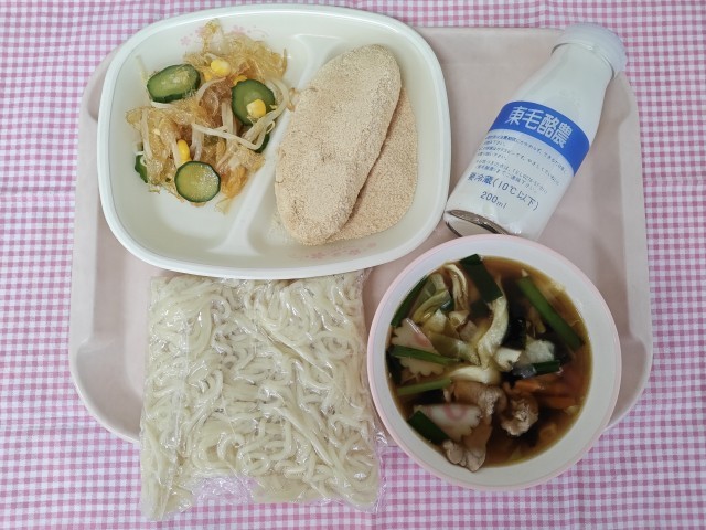 ラーメン 牛乳 きな粉揚げパン 寒天サラダ しょうゆラーメンスープ