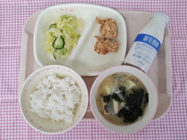 ごはん 牛乳 鶏のから揚げ たくあんの甘酢あえ 新玉ねぎとじゃがいもの味噌汁